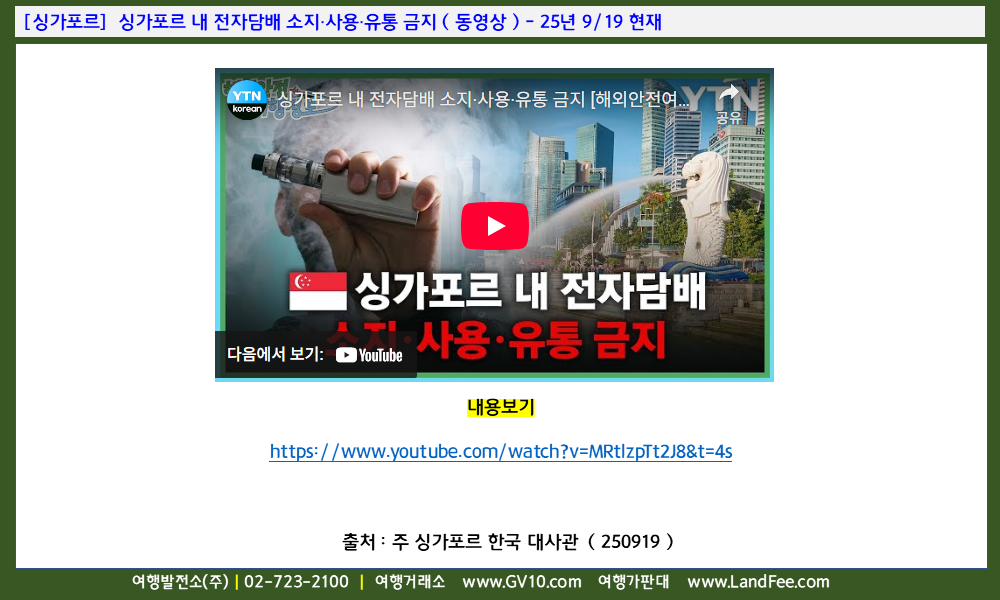 [싱가포르] 싱가포르 내 전자담배 소지·사용·유통 금지 ( 동영상 ) - 25년 9/19 현재