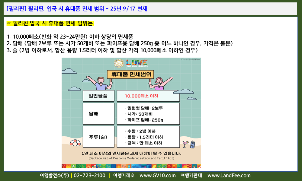 (2) 필리핀관광부 한국사무소의‘휴대품 면세 범위 안내’ 참고