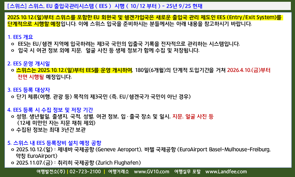 [스위스] 스위스, EU 출입국관리시스템 ( EES ) 시행 ( 10/12 부터 ) - 25년 9/25 현재