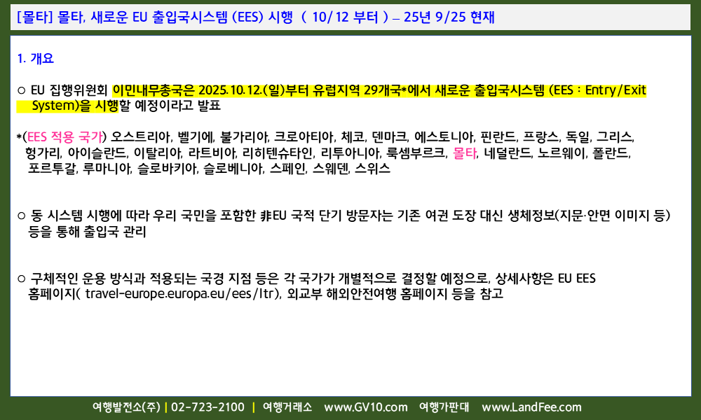 [몰타] 몰타, 새로운 EU 출입국시스템 (EES) 시행 ( 10/12 부터 ) – 25년 9/25 현재