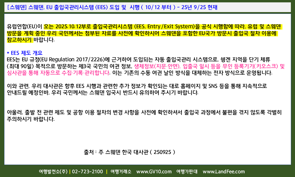 [스웨덴] 스웨덴, EU 출입국관리시스템 (EES) 도입 및 시행 ( 10/12 부터 ) - 25년 9/25 현재