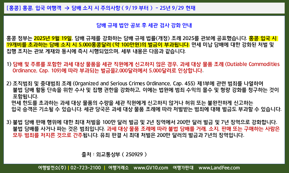 [홍콩] 홍콩, 입국 여행객 -> 담배 소지 시 주의사항 ( 9/19 부터 ) - 25년 9/29 현재