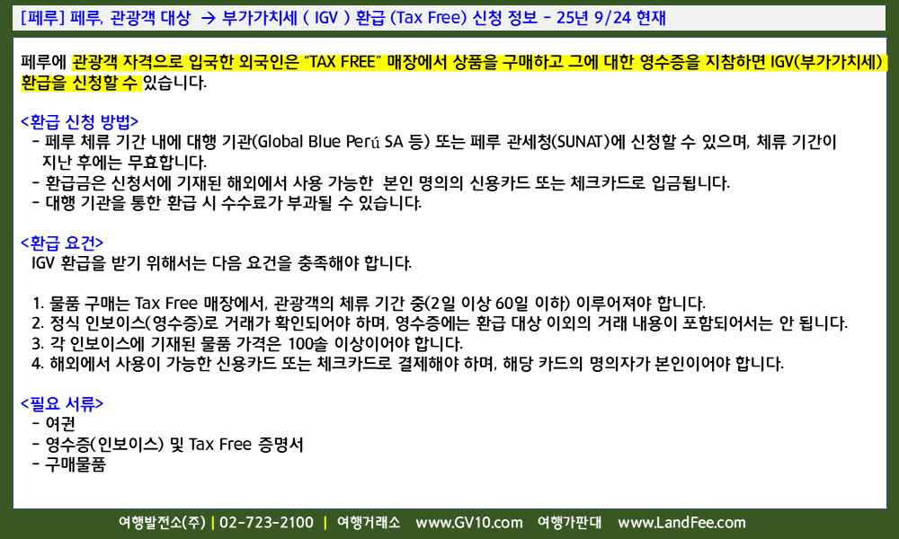 [페루] 페루, 관광객 대상 -> 부가가치세 ( IGV ) 환급 (Tax Free) 신청 정보 - 25년 9/24 현재