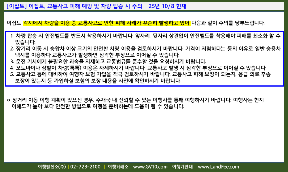 [이집트] 이집트, 교통사고 피해 예방 및 차량 탑승 시 주의 - 25년 10/8 현재