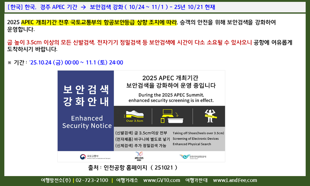 [한국] 한국, 경주 APEC 기간 -> 보안검색 강화 ( 10/24 ~ 11/1 ) - 25년 10/21 현재
