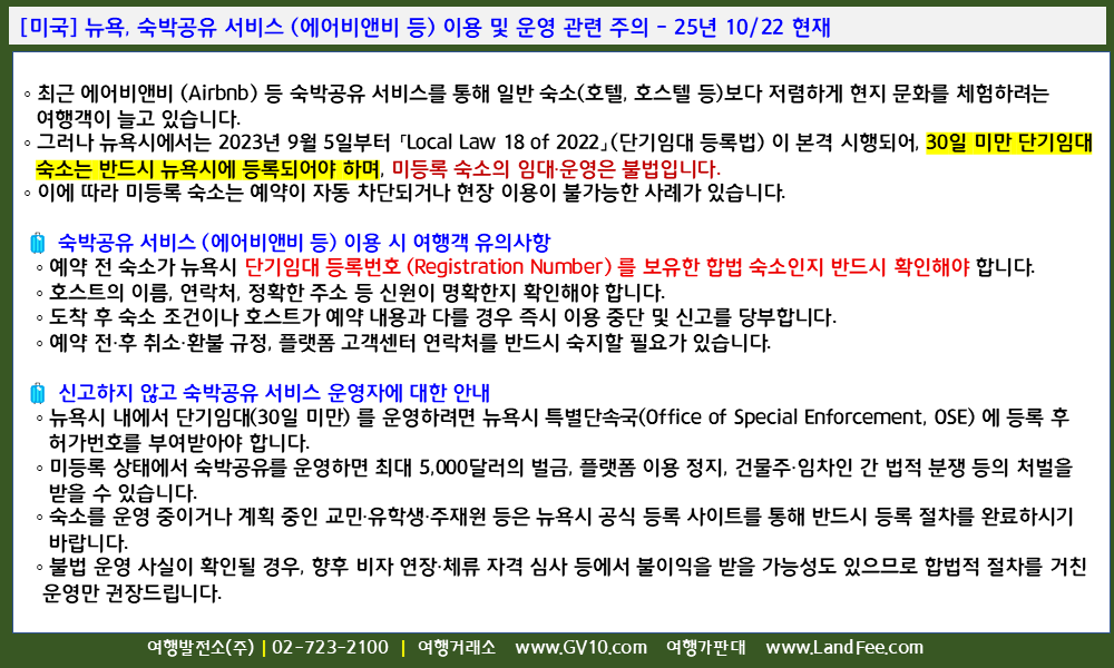 [미국] 뉴욕, 숙박공유 서비스 (에어비앤비 등) 이용 및 운영 관련 주의 - 25년 10/22 현재
