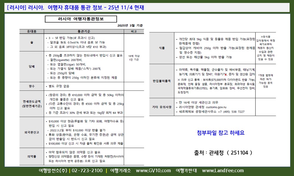 [러시아] 러시아, 여행자 휴대품 통관 정보 - 25년 11/4 현재