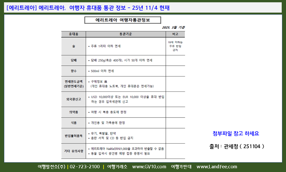 [에리트레아] 에리트레아, 여행자 휴대품 통관 정보 - 25년 11/4 현재