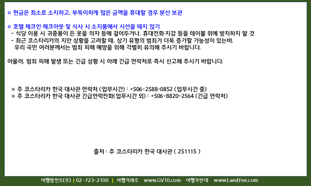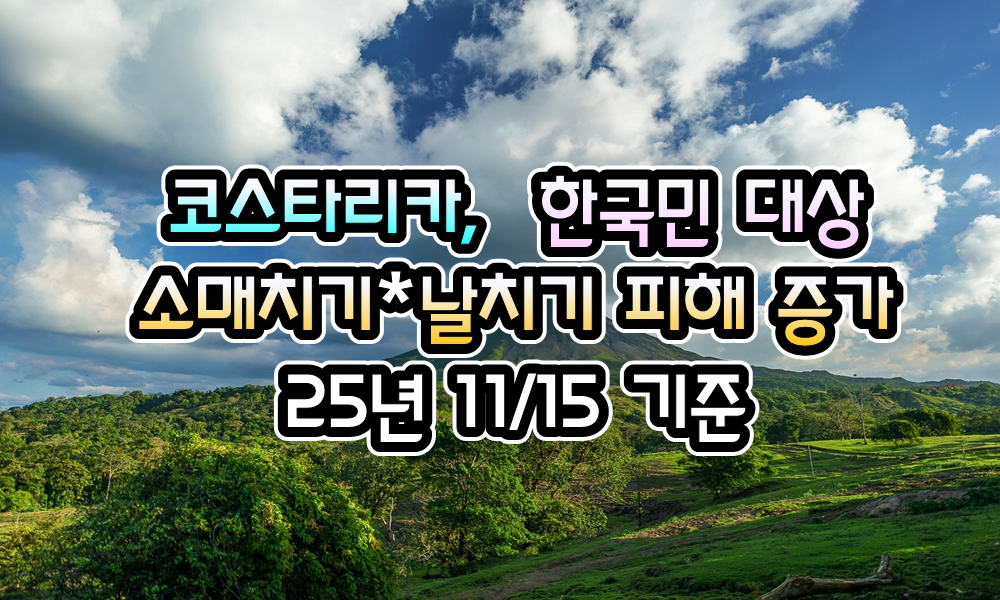 [코스타리카] 코스타리카, 한국민 대상 -> 소매치기·날치기 등 범죄피해 증가 - 25년 11/15 현재