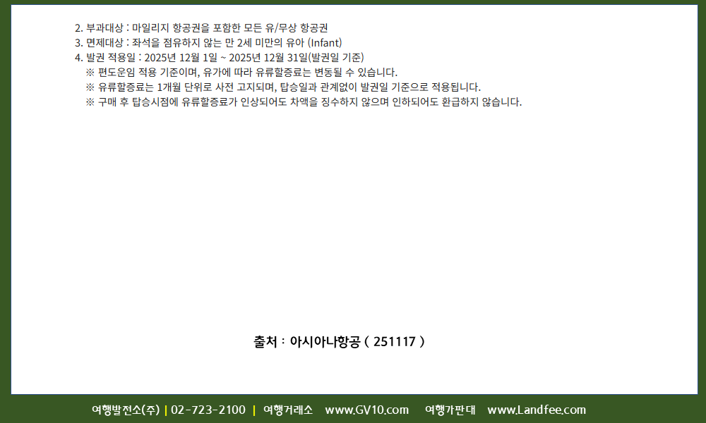 [KE/OZ] 2025년 12월 발권 국제선 유류할증료 안내 ( 25년 12/1 발권부터 적용 ) - 25년 11/17 현재