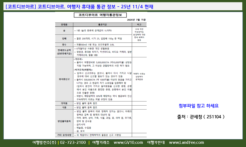 [코트디브아르] 코트디브아르, 여행자 휴대품 통관 정보 - 25년 11/4 현재