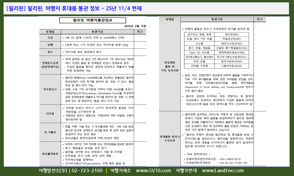 [필리핀] 필리핀, 여행자 휴대품 통관 정보 - 25년 11/4 현재