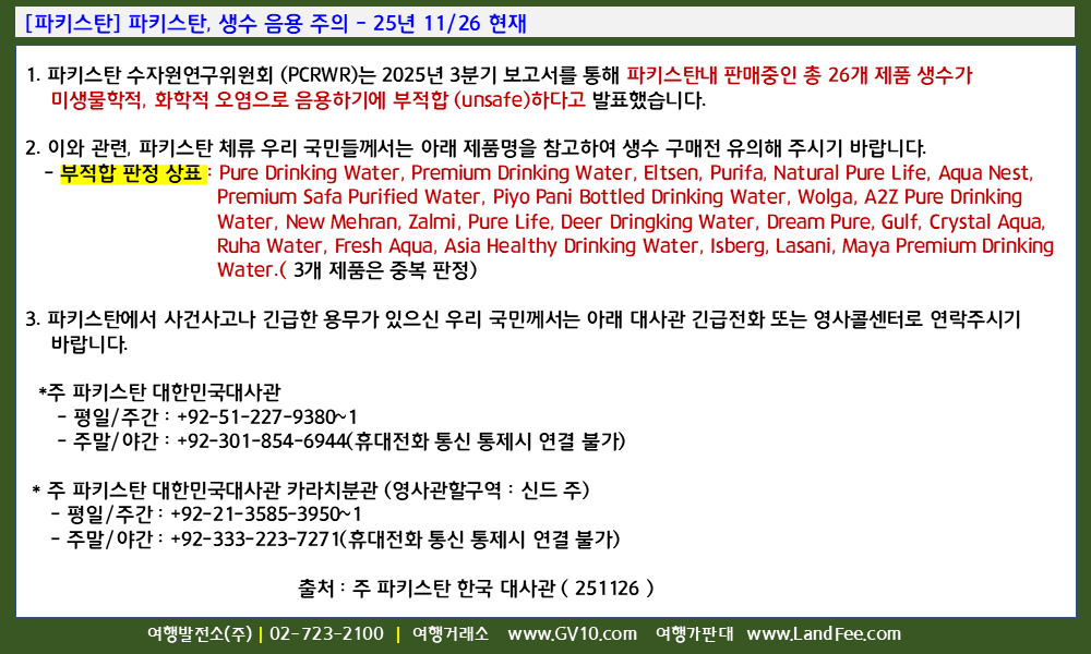 [파키스탄] 파키스탄, 생수 음용 주의 - 25년 11/26 현재