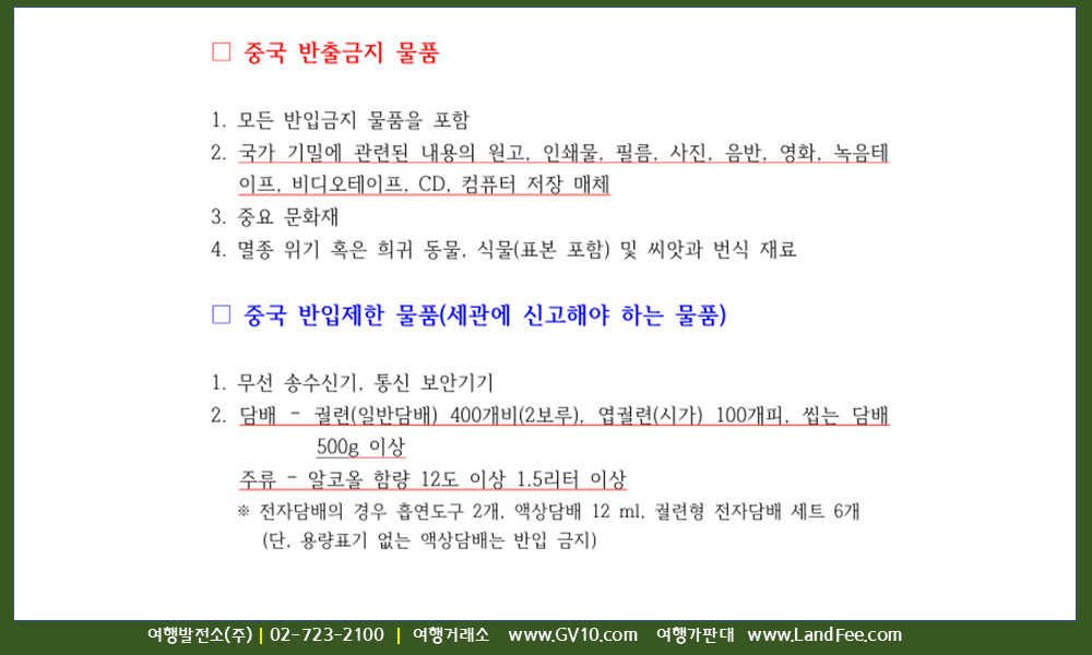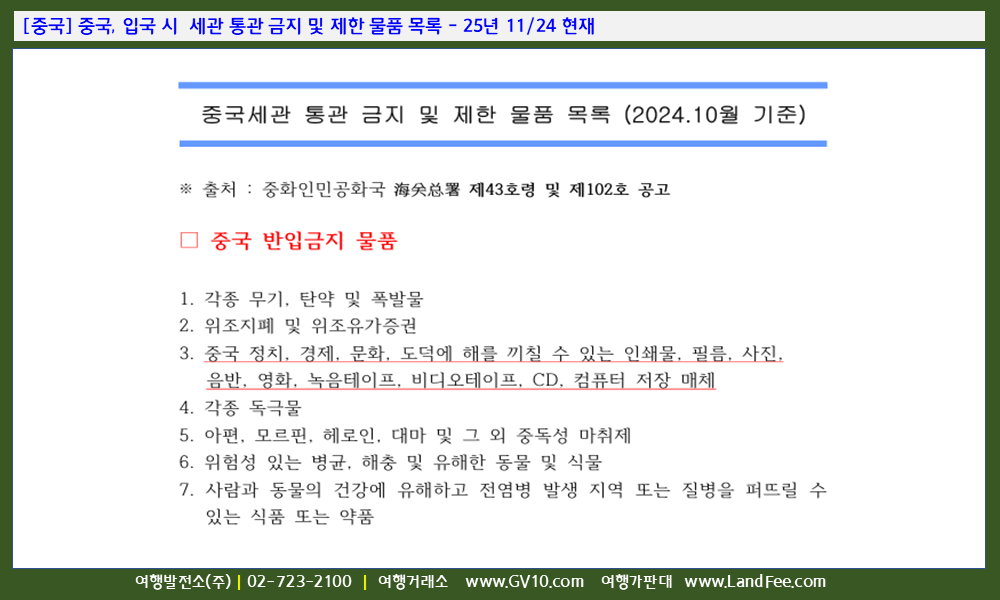 [중국] 중국, 입국 시 세관 통관 금지 및 제한 물품 목록 - 25년 11/24 현재