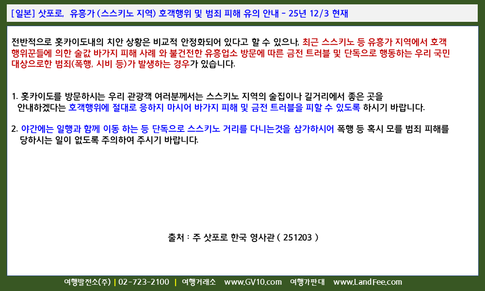 [일본] 삿포로, 유흥가 (스스키노 지역) 호객행위 및 범죄 피해 유의 안내 - 25년 12/3 현재
