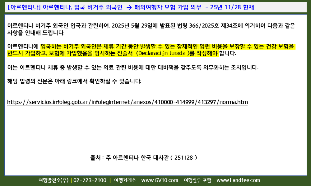 [아르헨티나] 아르헨티나, 입국 비거주 외국인 -> 해외여행자 보험 가입 의무 - 25년 11/28 현재