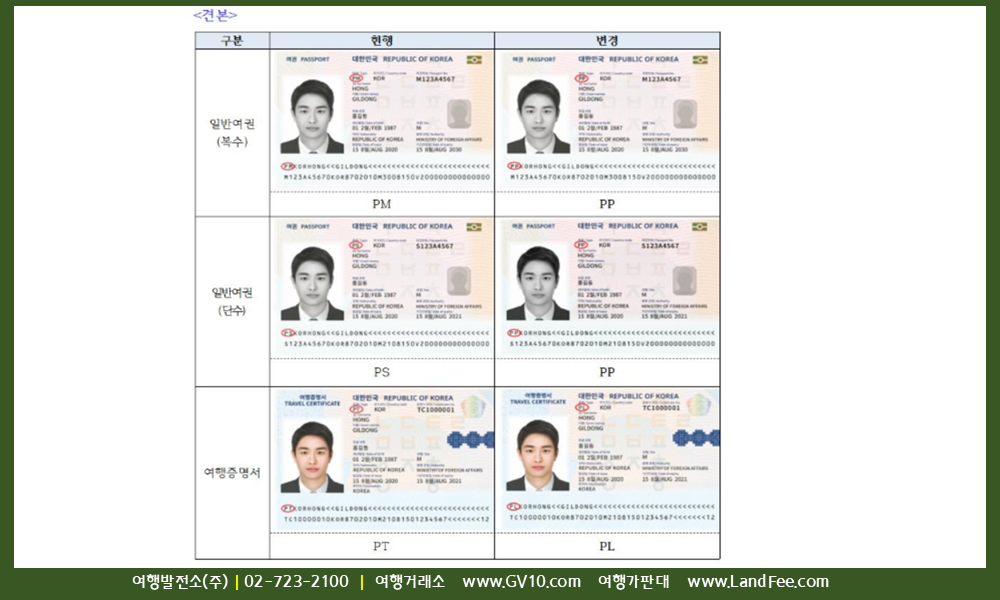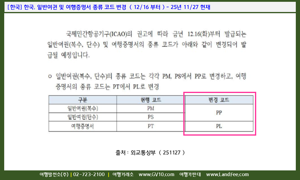 [한국] 한국, 일반여권 및 여행증명서 종류 코드 변경 ( 12/16 부터 ) - 25년 11/27 현재