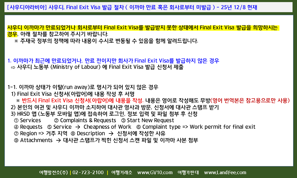 [사우디아라비아] 사우디, Final Exit Visa 발급 절차 ( 이까마 만료 혹은 회사로부터 미발급 ) - 25년 12/8 현재