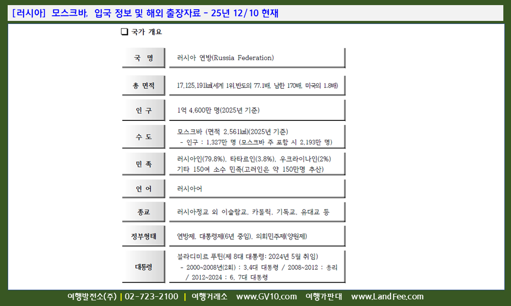 [러시아] 모스크바, 입국 정보 및 해외 출장자료 - 25년 12/10 현재