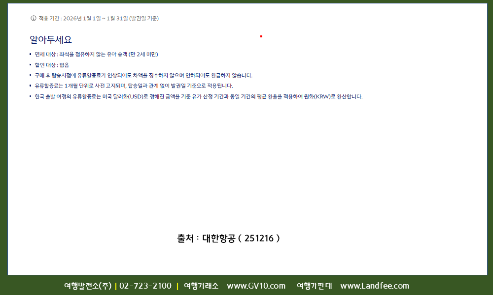 [KE/OZ] 2026년 1월 발권 국제선 유류할증료 안내 ( 26년 1/1 발권부터 적용 ) - 25년 12/16 현재