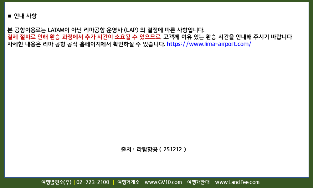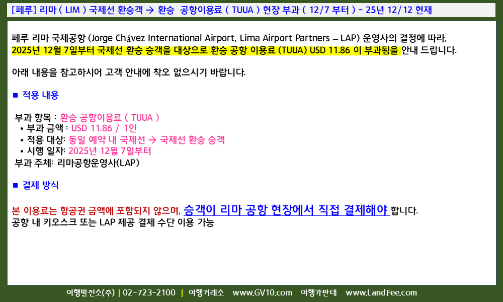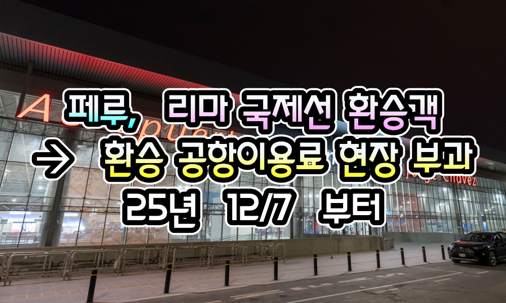 [페루] 리마 ( LIM ) 국제선 환승객 -> 환승 공항이용료 ( TUUA ) 현장 부과 ( 12/7 부터 ) - 25년 12/12 현재