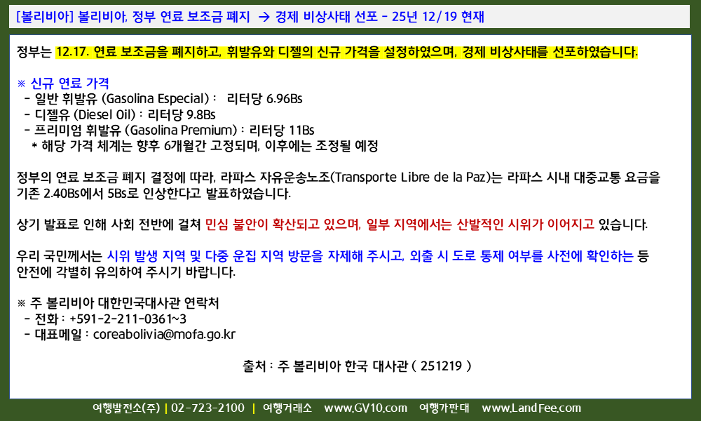 [볼리비아] 볼리비아, 정부 연료 보조금 폐지 -> 경제 비상사태 선포 - 25년 12/19 현재