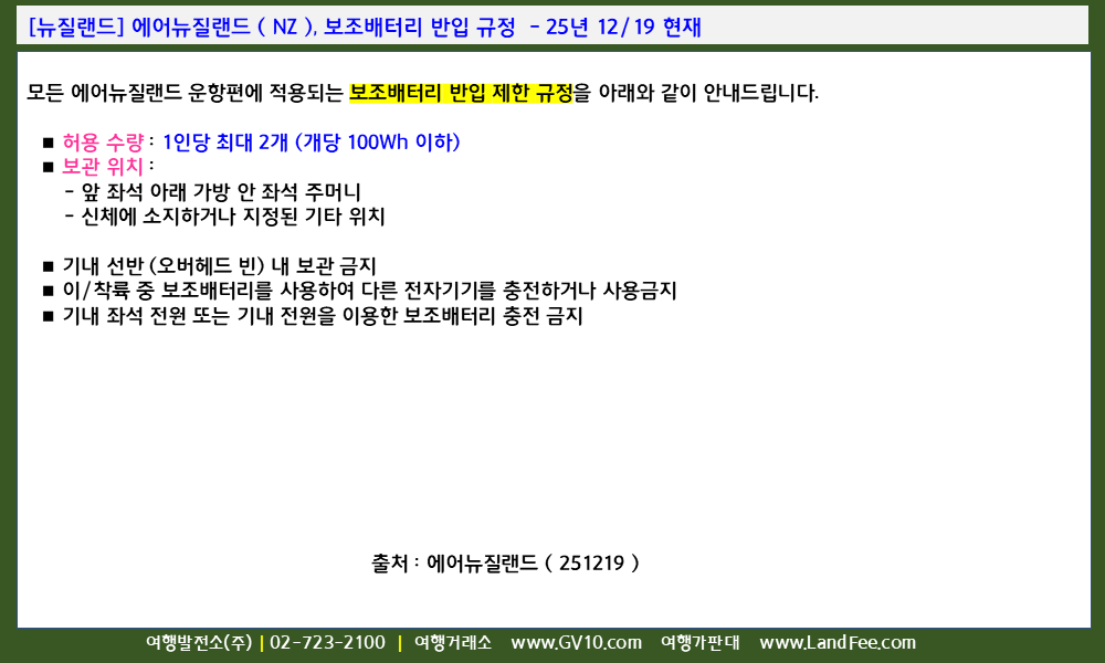 [뉴질랜드] 에어뉴질랜드 ( NZ ), 보조배터리 반입 규정 - 25년 12/19 현재