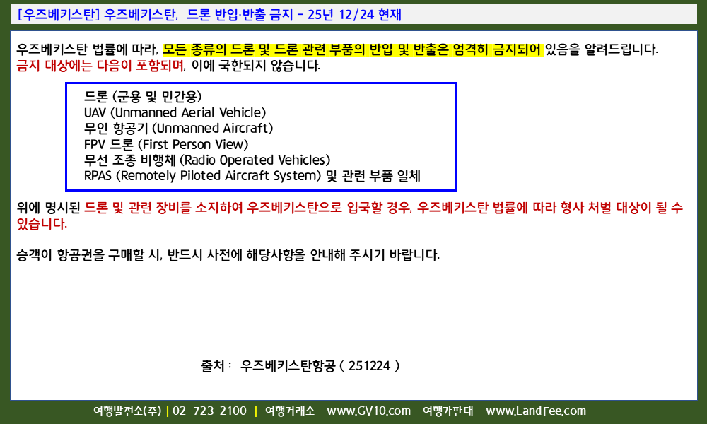 [우즈베키스탄] 우즈베키스탄, 드론 반입·반출 금지 - 25년 12/24 현재
