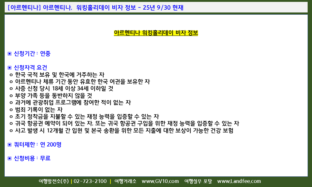 [아르헨티나] 아르헨티나, 워킹홀리데이 비자 정보 - 25년 9/30 현재