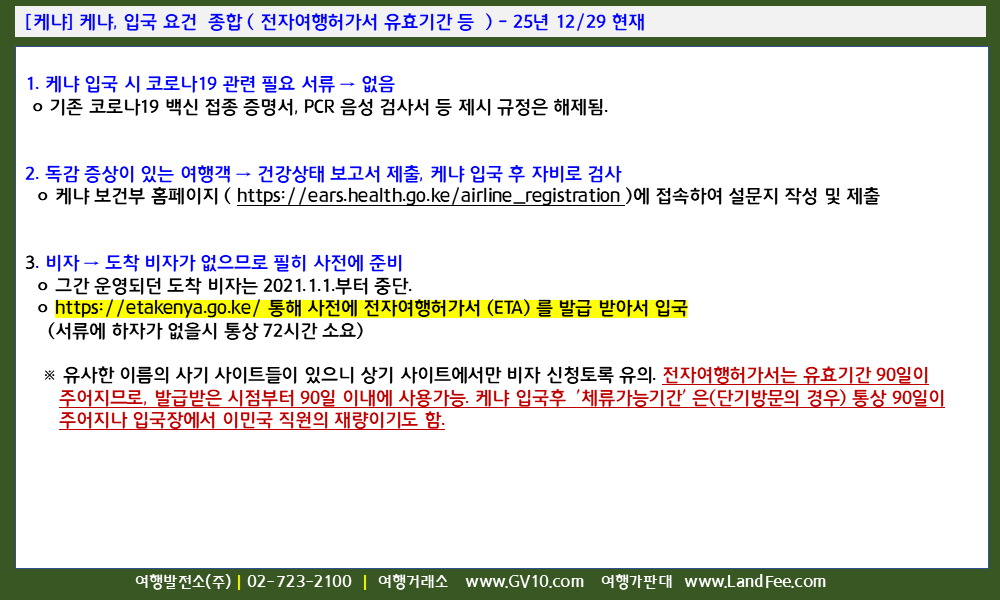 [케냐] 케냐, 입국 요건 종합 ( 전자여행허가서 유효기간 등 ) - 25년 12/29 현재