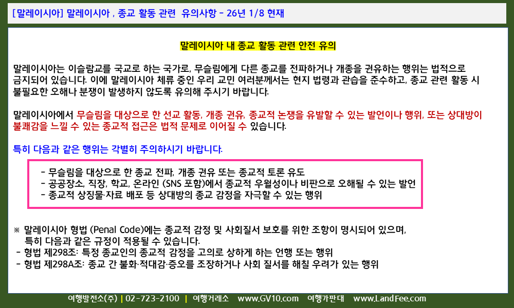 [말레이시아] 말레이시아 , 종교 활동 관련 유의사항 - 26년 1/8 현재