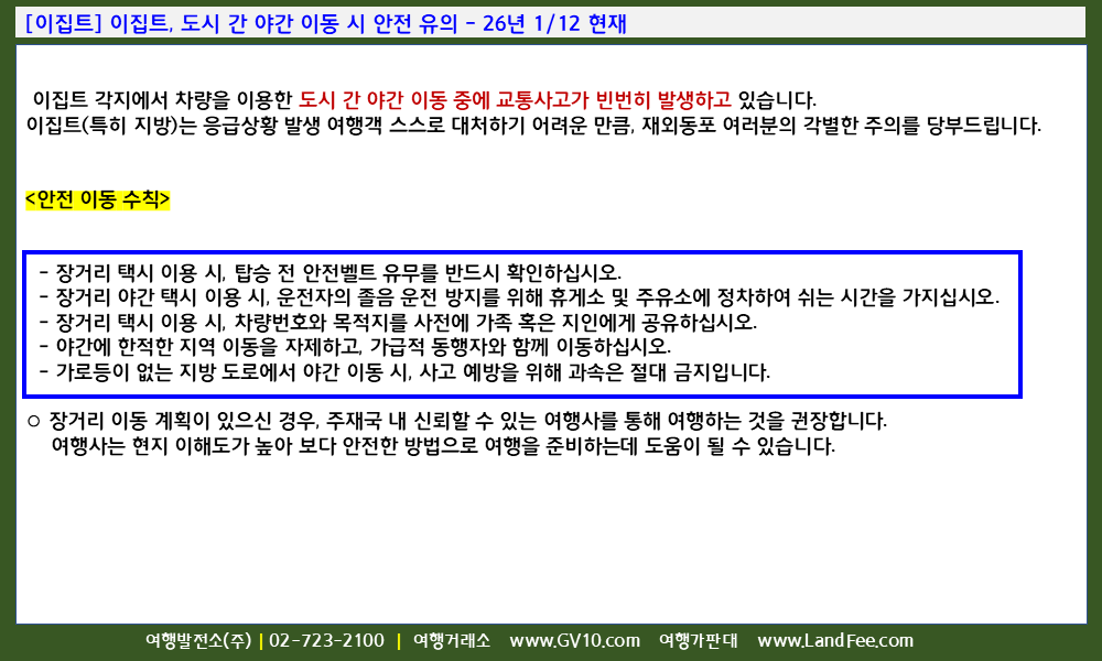 [이집트] 이집트, 도시 간 야간 이동 시 안전 유의 - 26년 1/12 현재