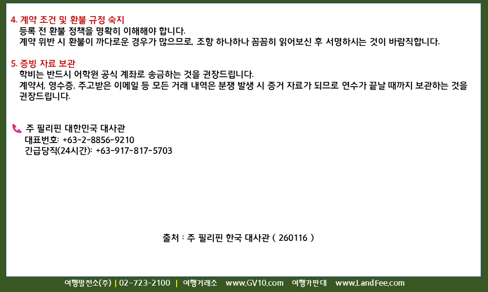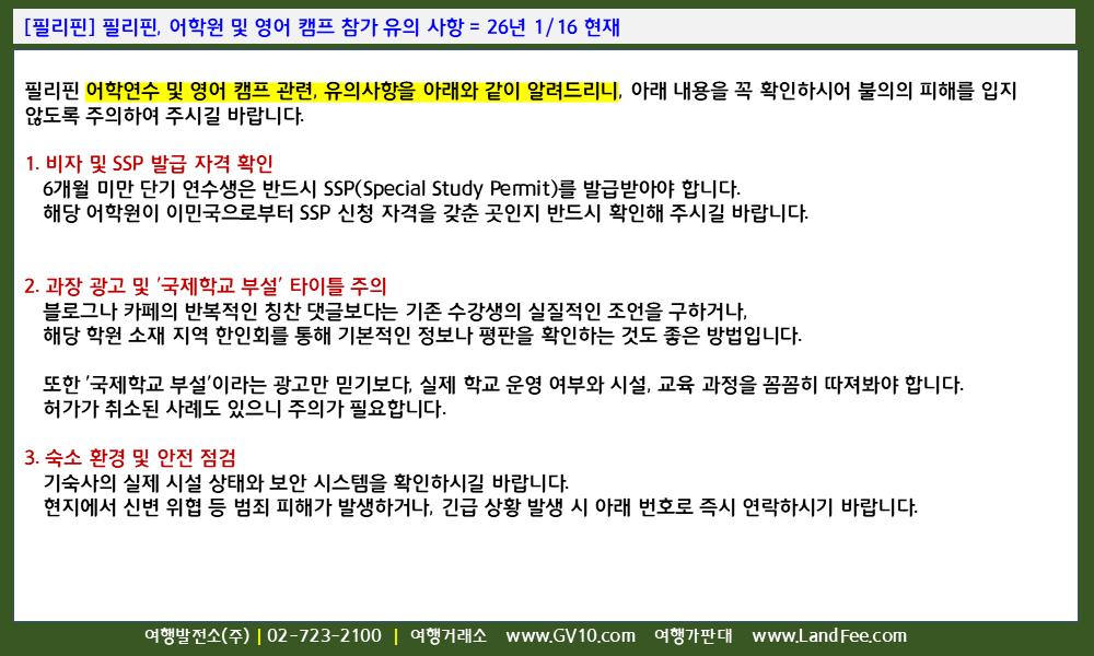 [필리핀] 필리핀, 어학원 및 영어 캠프 참가 유의 사항 - 26년 1/16 현재