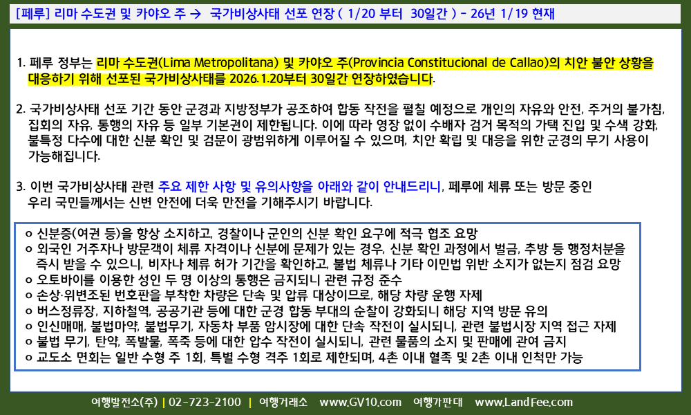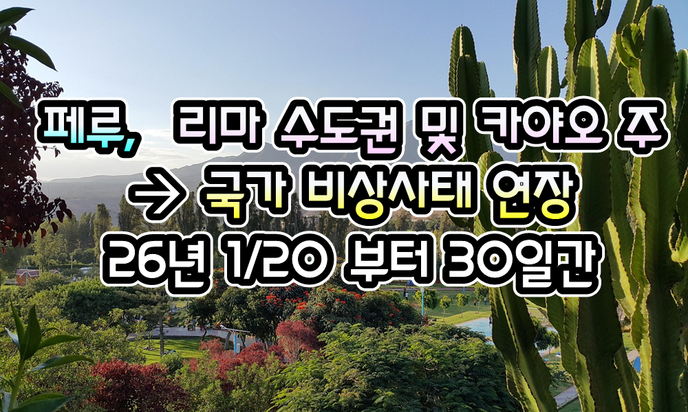 [페루] 리마 수도권 및 카야오 주 -> 국가비상사태 선포 연장 ( 1/20 부터 30일간 ) - 26년 1/19 현재