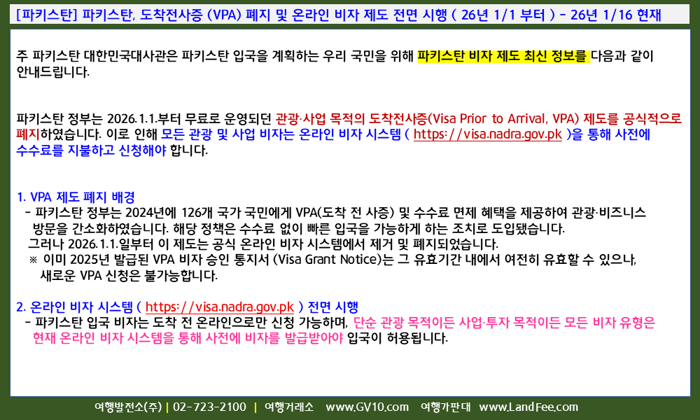 [파키스탄] 파키스탄, 도착전사증 (VPA) 폐지 및 온라인 비자 제도 전면 시행 ( 26년 1/1 부터 ) - 26년 1/16 현재