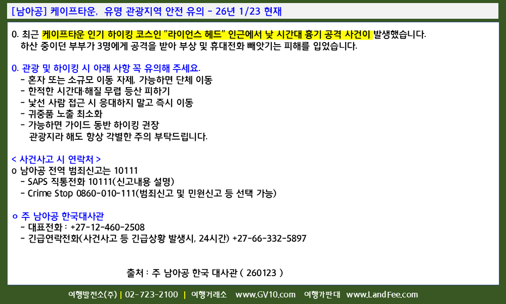 [남아공] 케이프타운, 유명 관광지역 안전 유의 - 26년 1/23 현재