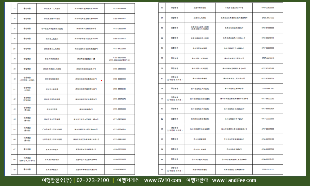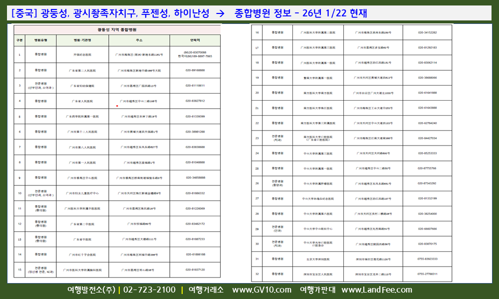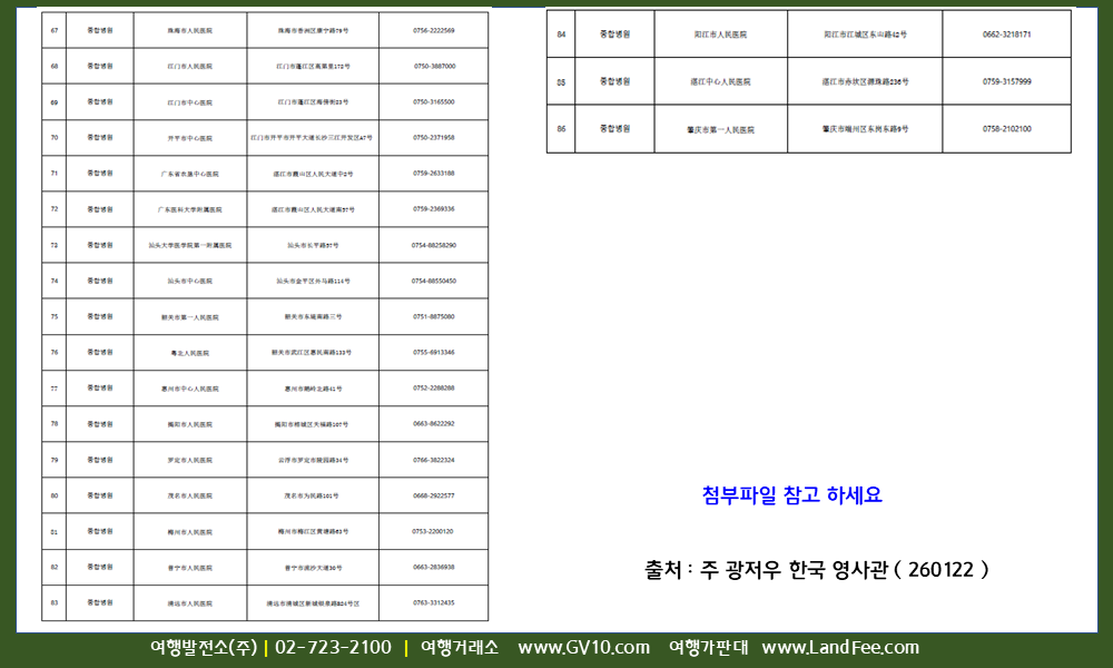 [중국] 광둥성, 광시좡족자치구, 푸젠성, 하이난성 -> 종합병원 정보 - 26년 1/22 현재