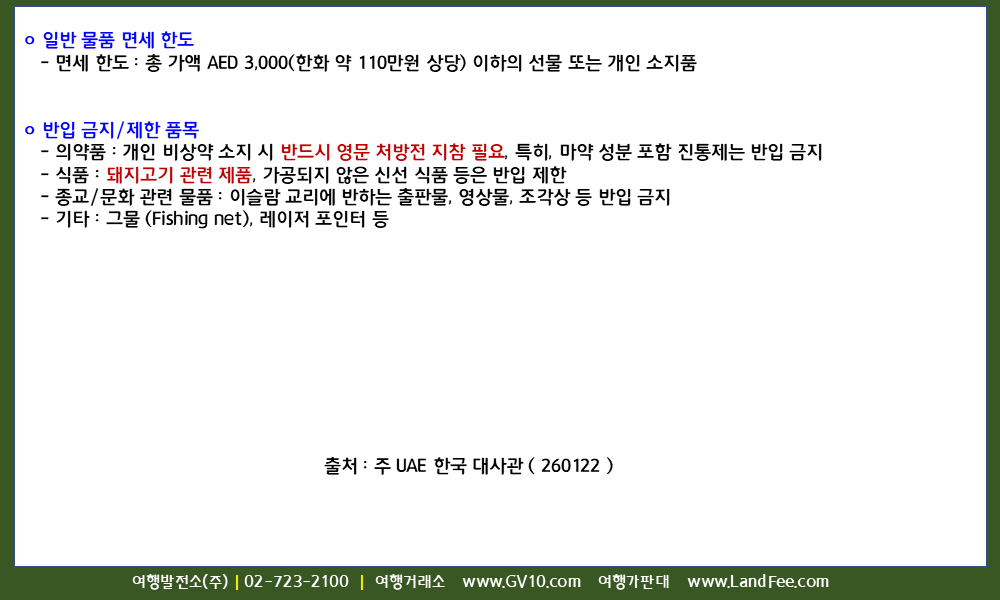 [UAE, 아랍에미리트] UAE, 입국 시 통관 및 면세 한도 기준 - 26년 1/22 현재