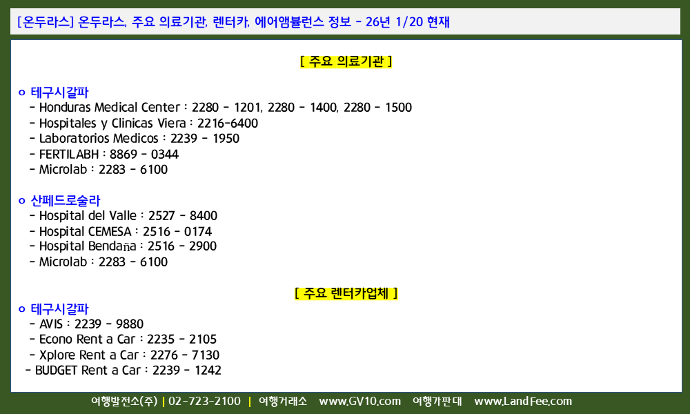 [온두라스] 온두라스, 주요 의료기관, 렌터카, 에어앰뷸런스 정보 - 26년 1/20 현재