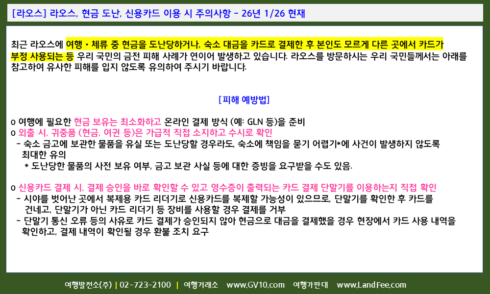 [라오스] 라오스, 현금 도난, 신용카드 이용 시 주의사항 - 26년 1/26 현재