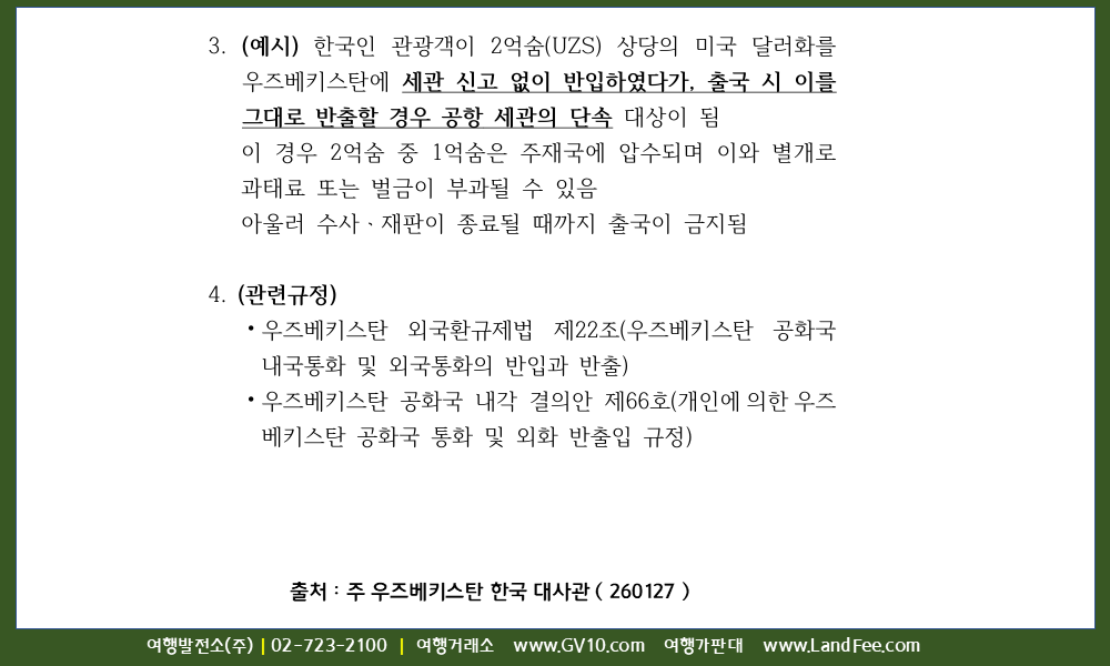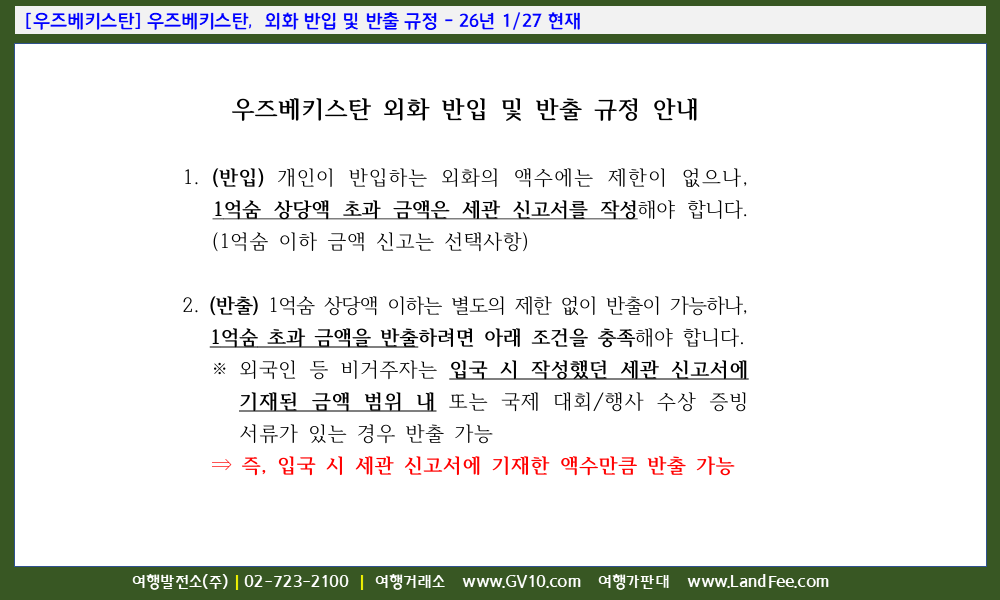[우즈베키스탄] 우즈베키스탄, 외화 반입 및 반출 규정 - 26년 1/27 현재