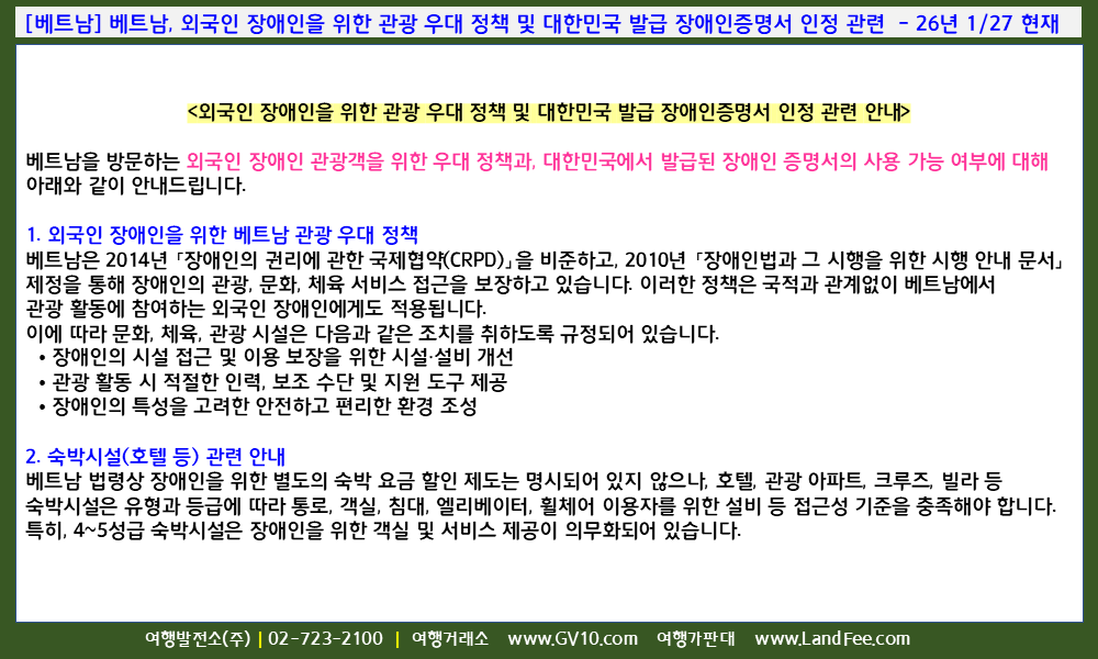 [베트남] 베트남, 외국인 장애인을 위한 관광 우대 정책 및 대한민국 발급 장애인증명서 인정 관련 - 26년 1/27 현재