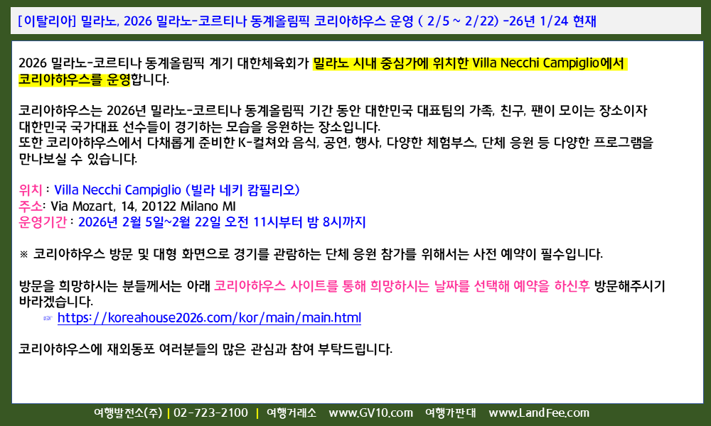 [이탈리아] 밀라노, 2026 밀라노-코르티나 동계올림픽 코리아하우스 운영 ( 2/5 ~ 2/22) -26년 1/24 현재