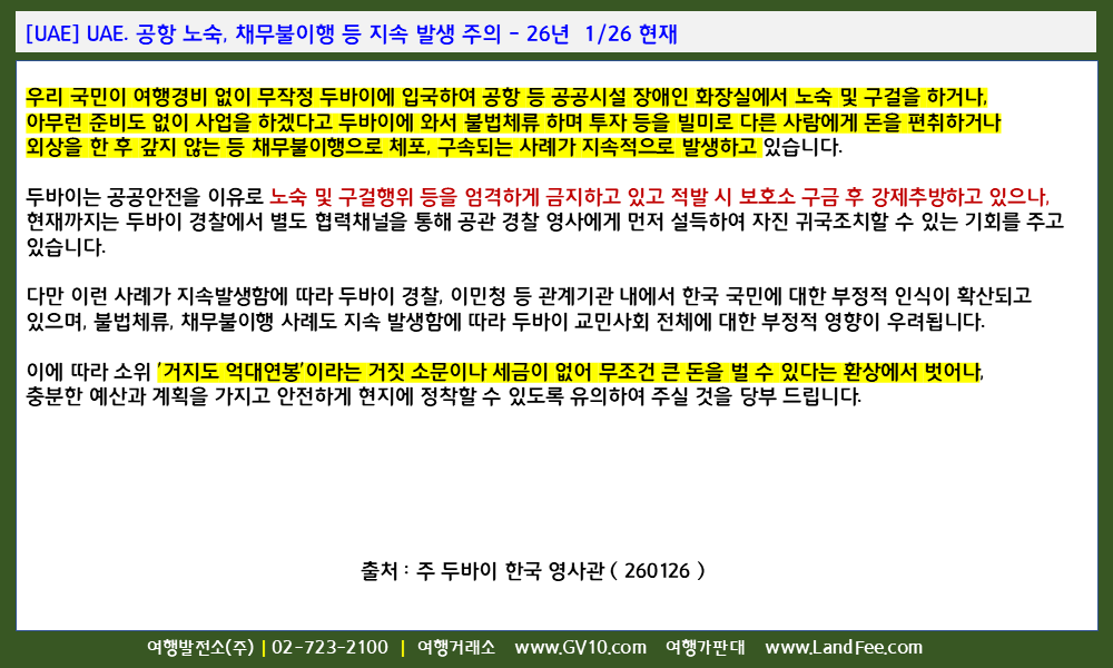[UAE, 아랍에미리트] UAE. 공항 노숙, 채무불이행 등 지속 발생 주의 - 26년 1/26 현재