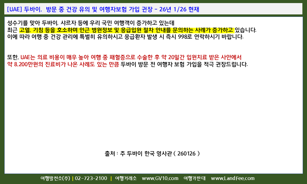 [UAE, 아랍에미리트] 두바이, 방문 중 건강 유의 및 여행자보험 가입 권장 - 26년 1/26 현재