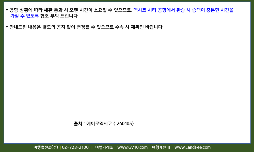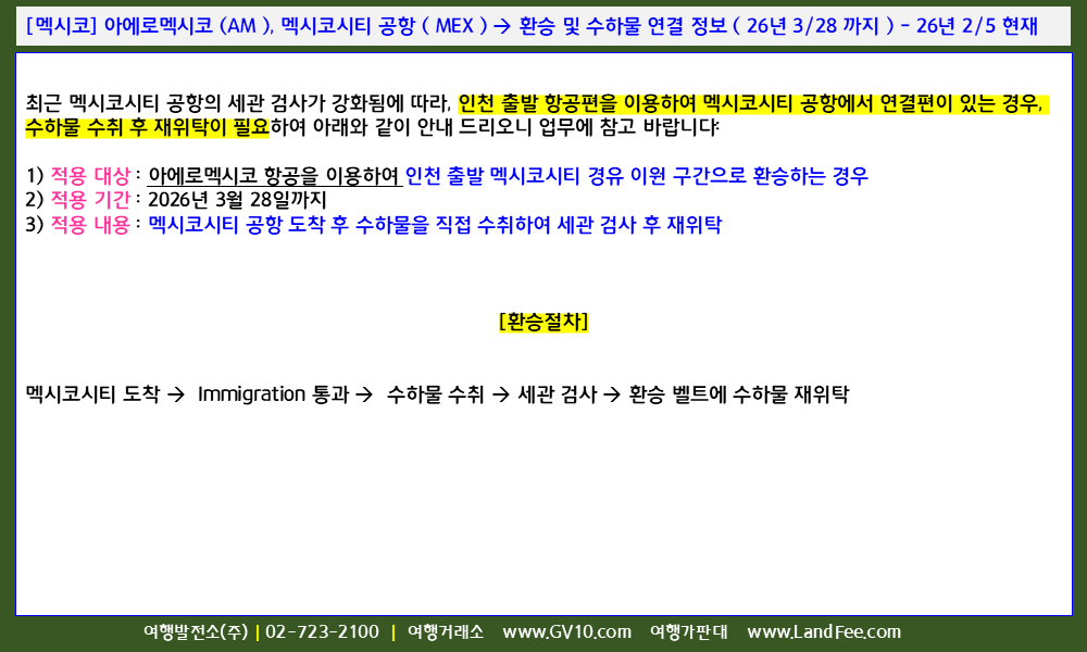[멕시코] 아에로멕시코 (AM ), 멕시코시티 공항 ( MEX ) -> 환승 및 수하물 연결 정보 ( 26년 3/28 까지 ) - 26년 2/5 현재