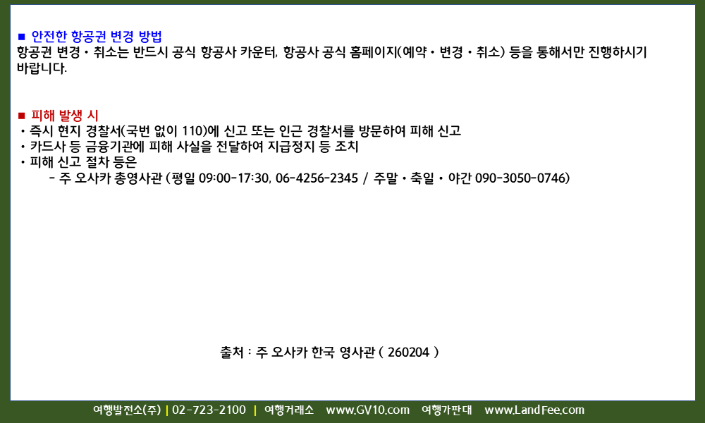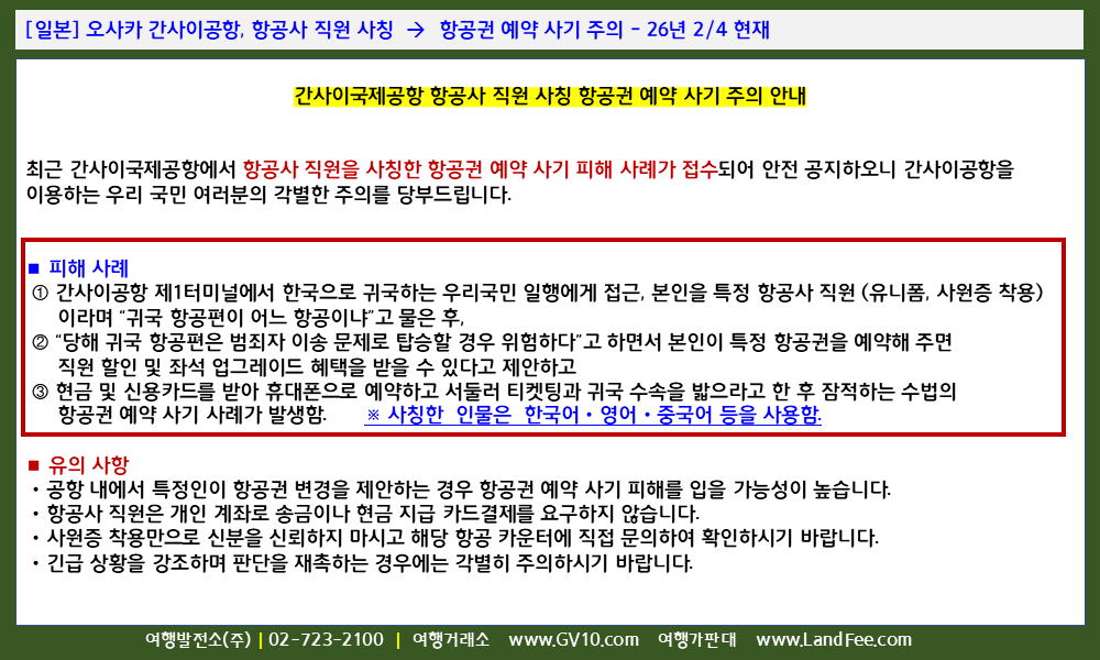 [일본] 오사카 간사이공항, 항공사 직원 사칭 -> 항공권 예약 사기 주의 - 26년 2/4 현재