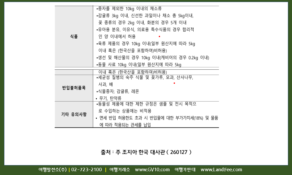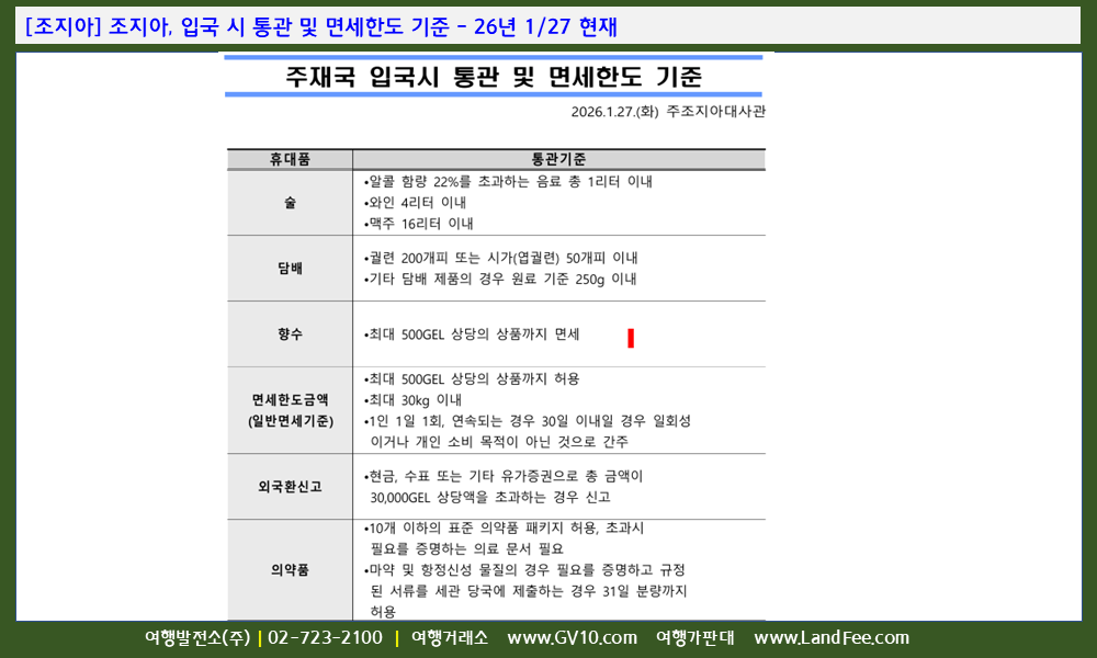 [조지아] 조지아, 입국 시 통관 및 면세한도 기준 - 26년 1/27 현재
