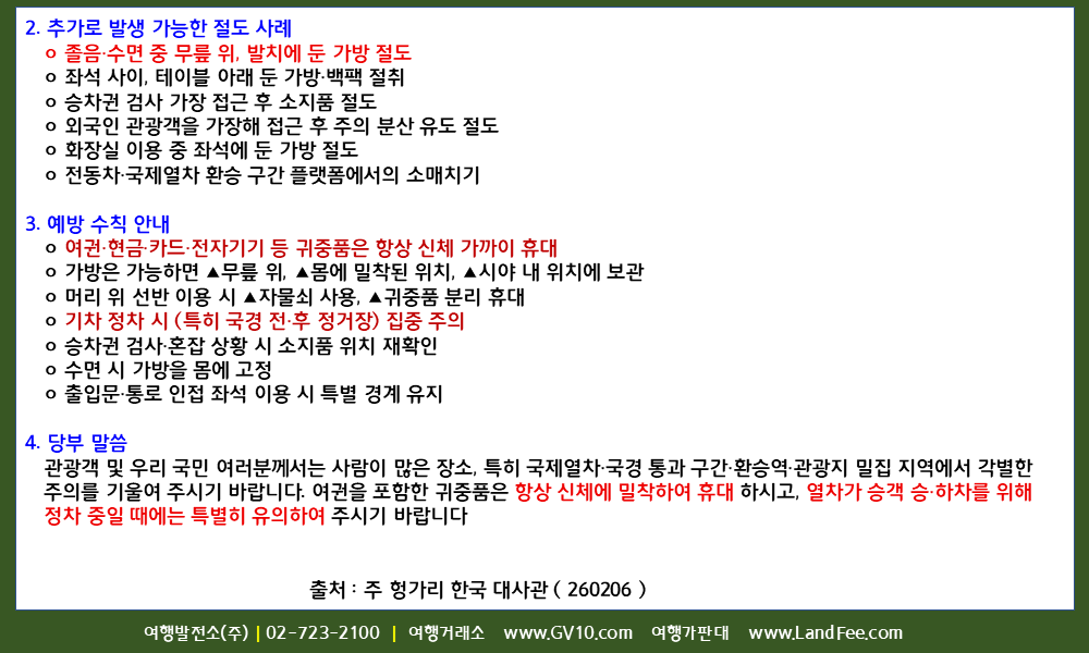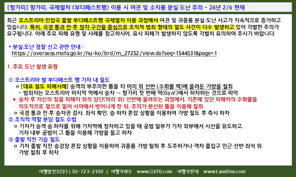 [헝가리] 헝가리, 국제열차 (부다페스트행) 이용 시 -> 여권 및 소지품 분실·도난 주의 - 26년 2/6 현재
