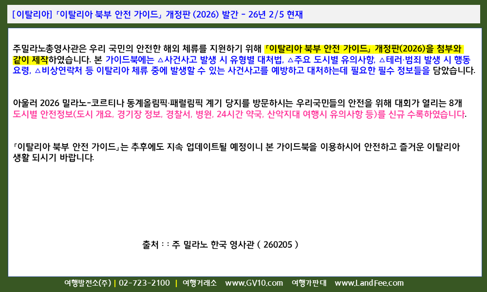 [이탈리아] 「이탈리아 북부 안전 가이드」 개정판 (2026) 발간 - 26년 2/5 현재